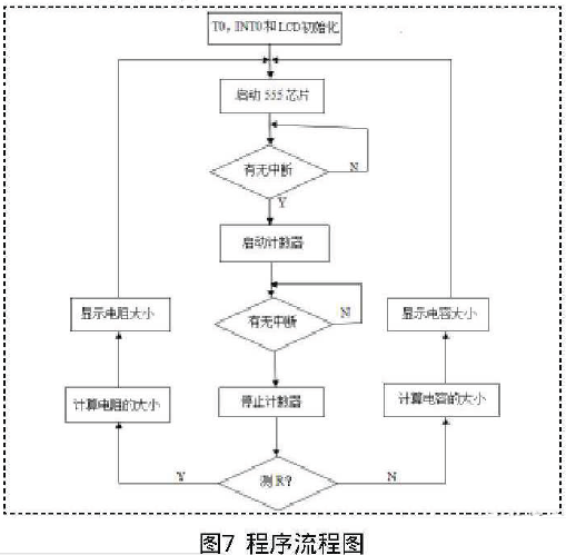 系统软件流程图如7所示。接通电源,首先是初始化工作,包括定时器T0、外部中断0和LCD1602的初始化。然后启动555芯片,通过单片机判断是否有中断请求,若无的话,继续等待中断请求;若有的话,启动定时器开始计时直到有中断请求时停止计时。得到计时值,即555输出信号的一个周期后,判断是测量电阻还是测量电容。判断后将电阻或者电容值由LCD1602显示出来。