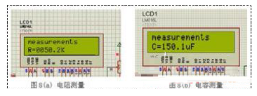 将上述各电路模块整合到一起,组成一个测量系统。采用Keil编写好程序无误后,在Proteus中进行电路仿真。分别测量一个50kΩ电阻和一个150μF电容的仿真结果如图8所示。从中可以看出,测量有一定的误差,这主要是因为采用前面公式计算时取了近似值。仿真通过后,按照仿真电路,购买需要的元器件,制作出实物电路。
