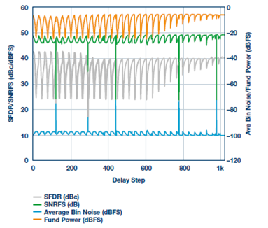 为了获得最佳延迟设置,将一个信号施加于THA和ADC组合,该信号应在ADC带宽范围之外。本例中,我们选择一个约10 GHz的信号,并施加-6 dBFS的电平(在FFT显示屏上捕获)。延迟设置现在以二进制步进方式扫描,信号的电平和频率保持恒定。在扫描过程中显示并捕获FFT,收集每个延迟设置对应的基波功率和无杂散动态范围(SFDR)数值。
