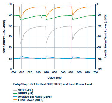 结果如图3a所示,基波功率、SFDR和SNR将随所应用的每个设置而变化。如图所示,当把采样位置放在更好的地方(THA将样本送至ADC的过程之中)时,基波功率将处于最高水平,而SFDR应处于最佳性能(即最低)。图3b为延迟映射扫描的放大视图,延迟设定点为671,即延迟应该保持固定于此窗口/位置。请记住,延迟映射程序仅对系统的相关采样频率有效,如果设计需要不同的采样时钟,则需要重新扫描。本例中,采样频率为4 GHz,这是该信号链中使用的THA器件的最高采样频率。