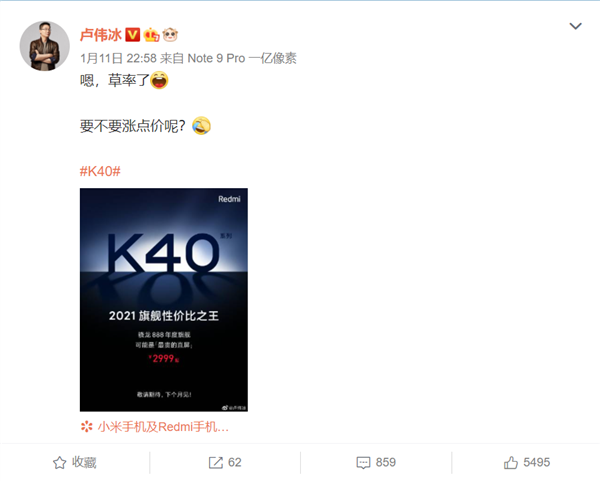 1月11日晚间,小米集团中国区总裁、Redmi品牌总经理卢伟冰表示,Redmi K40系列2999元定价有点草率了,要不要涨点价格?