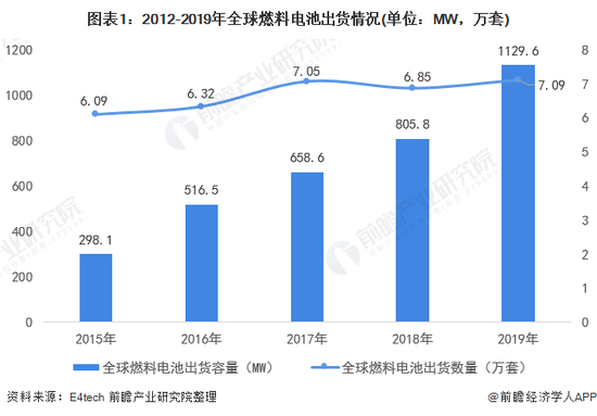 近年来,全球燃料电池市场正进入快速增长期。根据瑞士咨询机构E4tech在2020年4月发布的《2019燃料电池产业回顾》数据显示,2019年全球燃料电池出货容量达到1129.6MW,同比增长40%;燃料电池出货数量为7.09万套。