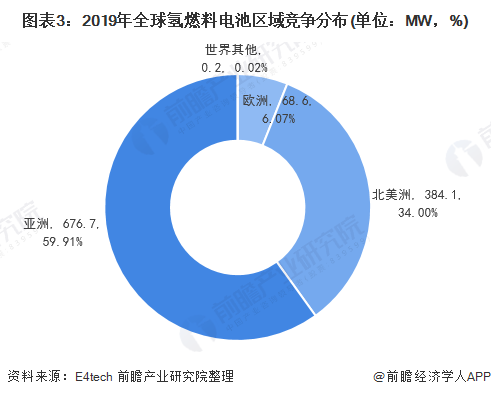 按照区域出货量占比来看,2019年亚洲燃料电池系统出货量为676.7MW,占全球的比重达59.91%,居于首位;其次是北美洲,其燃料电池系统出货量为384.1MW,占全球的比重达34%。