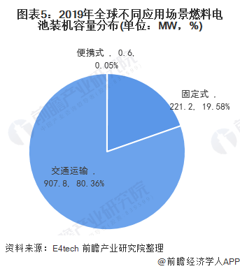 从燃料电池的应用场景的分布情况来看,2019年全球氢燃料电池在交通领域的出货量达到907.8MW,占总出货量的80.36%,高居首位,其次是固定式燃料电池出货量为221.2MW,占比为19.58%。