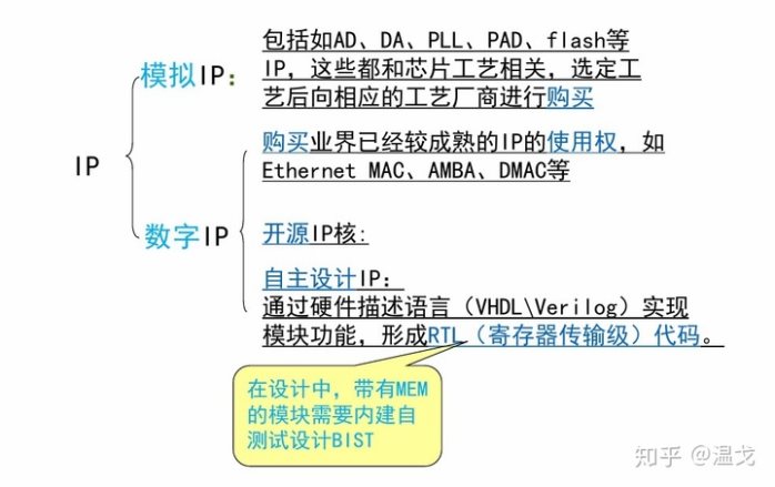 而用 RTL 实现的各种功能模块,来组成一个实现具体功能的 IP,SOC 芯片最终由 SOC integration 工程师把各个 IP 集成到一起。