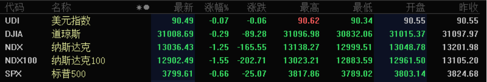 美股方面,道琼斯工业平均指数小幅下跌89.28点,跌幅为0.29%,报31008.69点。纳斯达克综合指数下跌165.55点,跌幅为1.25%,报13036.43点。None小幅下跌25.07点,跌幅为0.66%,报3799.61点。