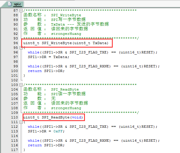这两个函数就是我们使用到的接口,在上面SPI配置好之后,操作这两个函数就可以控制其引脚读写了。