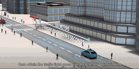 接收到红绿灯信息后,汽车会自动调整车速,以合适的速度通过红绿灯。如果经过测算,车辆无法在限速范围内通过路口,车辆就会自动加速、刹停。