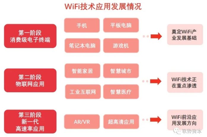 WiFi技术具有短距传输、高速率等特点,率先在手机、笔记本电脑等消费级电子终端设备上实现大规模应用,并逐步向物联网、虚拟现实等应用场景渗透。