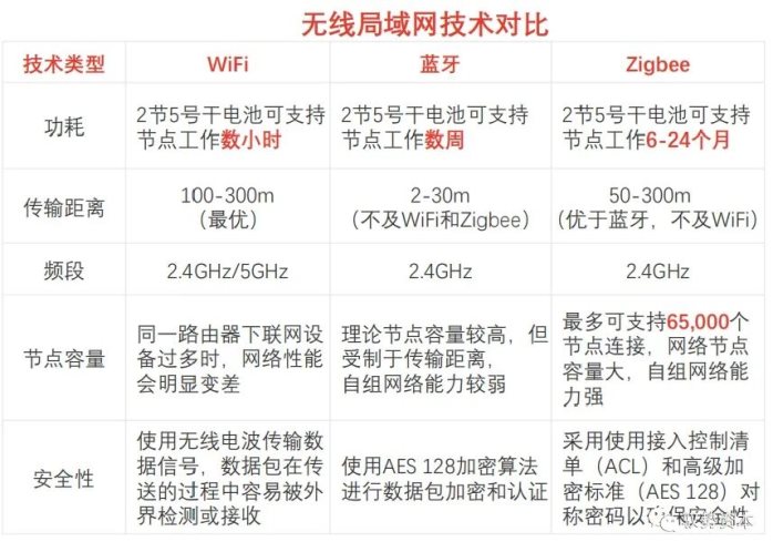 在物联网通信技术体系中,WiFi、蓝牙、Zigbee同属无线局域网技术,主要面向通信范围较小的场景,三类技术在传输速率、传输距离、功耗等方面存在差异。