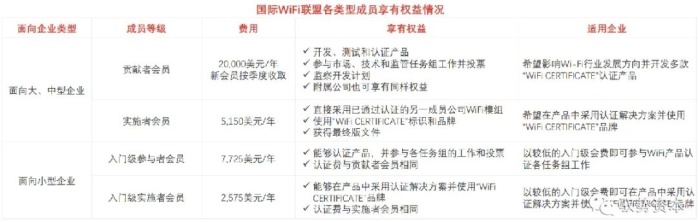 国际WiFi联盟根据各类企业对产品认证的不同需求设置4个成员级别,不同级别成员需交付费用、享有权益各不相同。