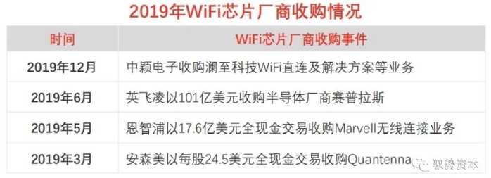 WiFi芯片市场发展前沿:WiFi 6为最新WiFi技术标准,博通、高通、Marvell等WiFi芯片头部厂商逐步加快推广WiFi 6芯片产品。2019年,WiFi芯片市场发生多起芯片厂商收购事件,传统集成电路头部厂商通过收购WiFi芯片相关厂商打进WiFi产业链上游市场,为其在物联网应用市场的战略布局作铺垫。