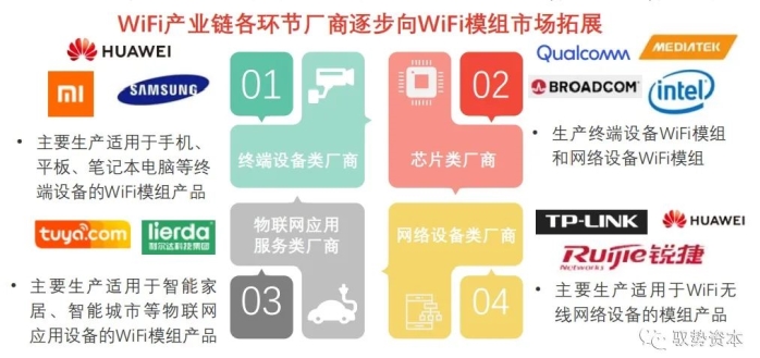 WiFi产业链各环节厂商逐步向WiFi模组市场拓展,按照模组产品的应用特性可将WiFi模组厂商分为终端设备类厂商、芯片类厂商、物联网应用服务类厂商和网络设备类厂商。