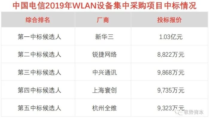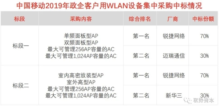 WLAN设备市场竞争格局:WLAN设备市场集中度高,思科、Aruba-HPE、Ubiquiti、ARRIS、华为占据全球市场约80%份额,而中国市场中,新华三、锐捷网络、华为、信锐技术、思科的市场份额约共达90%。在中国通信运营商2019年WLAN设备大型集中采购项目中,锐捷网络、新华三多次中标。