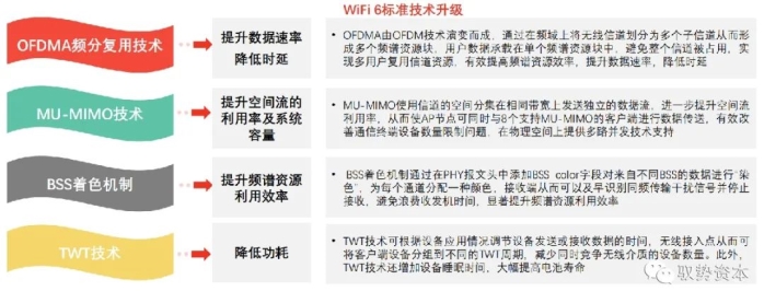 WiFi 6标准通过引入OFDMA频分复用技术、MU-MIMO技术、BSS着色机制、TWT技术等技术实现升级发展。