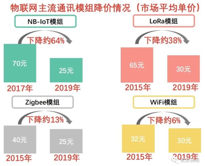 在传统消费级电子终端市场发展步伐趋于滞缓的背景下,WiFi技术逐步转移目标应用市场,正重点渗透物联网应用场景。在物联网应用场景中,WiFi技术面临来自NB-IoT、LoRa、Zigbee等无线传输技术竞争。相比NB-IoT、LoRa等技术,WiFi技术在功耗、连接设备数量等方面处于劣势。此外,WiFi模组价格下滑幅度小于其他技术模组产品,不利于其在物联网领域进一步应用推广。