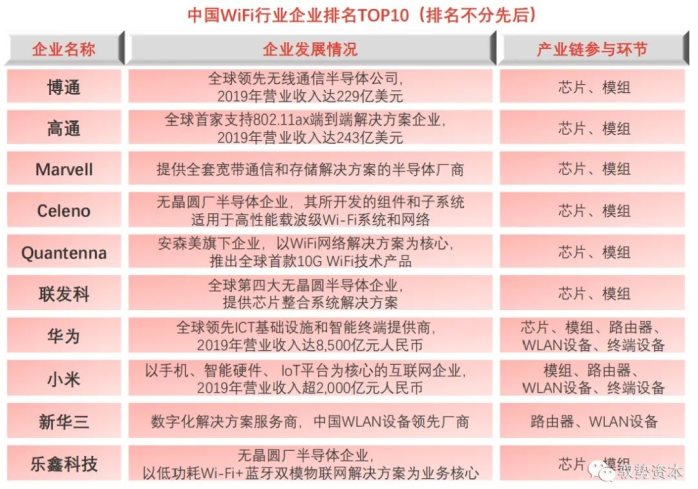 TOP10(排名不分先后)企业包括博通、高通、Marvell、Celeno、Quantenna、联发科、华为、小米、新华三、乐鑫科技。