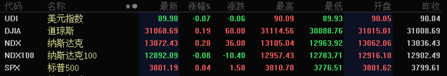 美股方面,道琼斯工业平均指数小幅上涨60.00点,涨幅为0.19%,报31068.69点。纳斯达克综合指数小幅上涨36.00点,涨幅为0.28%,报13072.43点。None小幅上涨1.58点,涨幅为0.04%,报3801.19点。