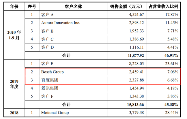 这两个明星股东也为禾赛科技的营收做了较大贡献。2019年,博世和百度分列其前五大客户第二和第三位,合计贡献营收4787.29万元,占当年营业收入13.74%。