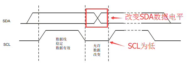 SCL时钟电平为低, 可以改换SDA数据线的电平,在SCL上升沿的过程将SDA数据发送出去。