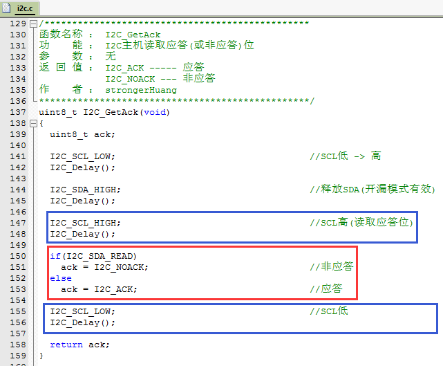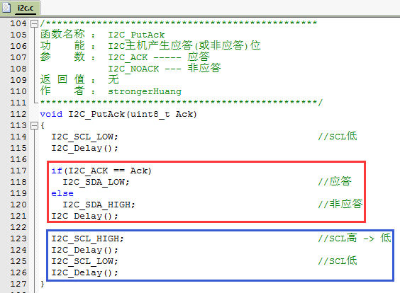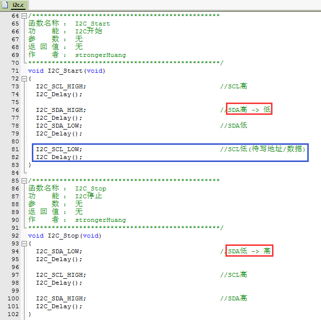 (注意:开始之后将SCL变为低电平,防止误操作SDA使其通信停止,见源代码)