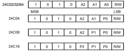 I2C的开始信号之后的第一步就是发送设备物理地址, AT24Cxx的物理地址的格式如上面: