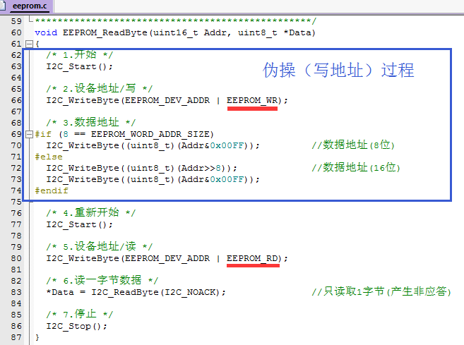 EEPROM读(或写)一字节数据需要I2C多次通信过程,下面将讲述几个重要的内容: