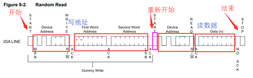 截图来自“AT24C128C数据手册”,单字节读(也是随机读)主要分7个步骤: