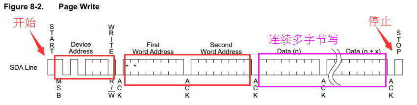 截图来自“AT24C128C数据手册”,页写和单字节写的区别在于“连续写”。