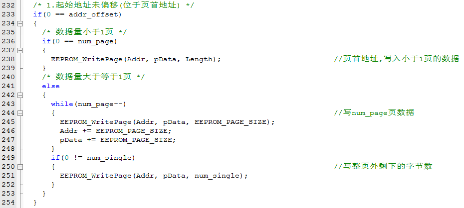 上面源程序截取了简单的一部分:开始写的地址刚好位于该页首地址这种情况。在页首地址开始写数据情况下,要判断需要写的数据的大小是否有多页。