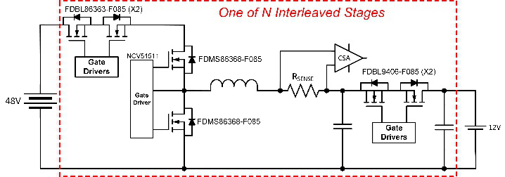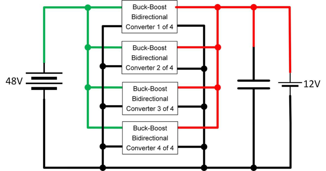 随着大量新型轻度混合动力汽车的普及,越来越多的汽车配备了 48 V 电池子系统,从而需要使用 48 V 至 12 V 转换器。虽然可以使用许多不同的转换器拓扑结构,但双向交错式同步降压 / 升压转换器由于其简单高效性而成为使用最广泛的结构。