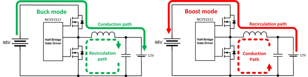 降压拓扑结构提供压降,在本例中为 48 V 至 12 V 的压降,而升压拓扑结构提供相反的功率转换。同步拓扑结构在 2 种模式下使电源开关在大部分时间内保持全开状态,从而提高转换器的总体效率。
