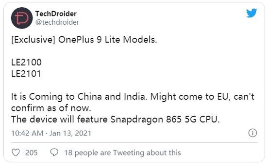 据爆料人 TechDroider 透露,据说一加 9 Lite 有两个型号,分别是 LE2100 和 LE2101,将在印度和中国发售,与一加 9 和 9 Pro 的区别在于,“Lite”版本将采用去年的骁龙 865 处理器,而不是最新的骁龙 888。有趣的是,一加 9E 也被传出搭载骁龙 865,这让我们不得不怀疑一加 9E 和 9 Lite 是否是同一款设备。它们有可能是同一款设备,或者至少非常相似,“Lite”机型将面向印度和中国市场,而 9E 将面向美国和欧洲市场。