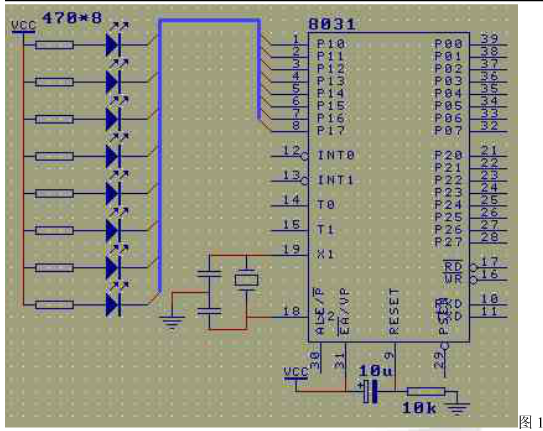 我们的第一个任务是要用单片机点亮一只发光二极管LED,显然,这个LED必须要和单片机的某个引脚相连,否则单片机就没法控制它了,那么和哪个引脚相连呢?单片机上除了刚才用掉的5个引脚,还有35个,我们将这个LED和1脚相连。(见图1,其中R1是限流电阻)