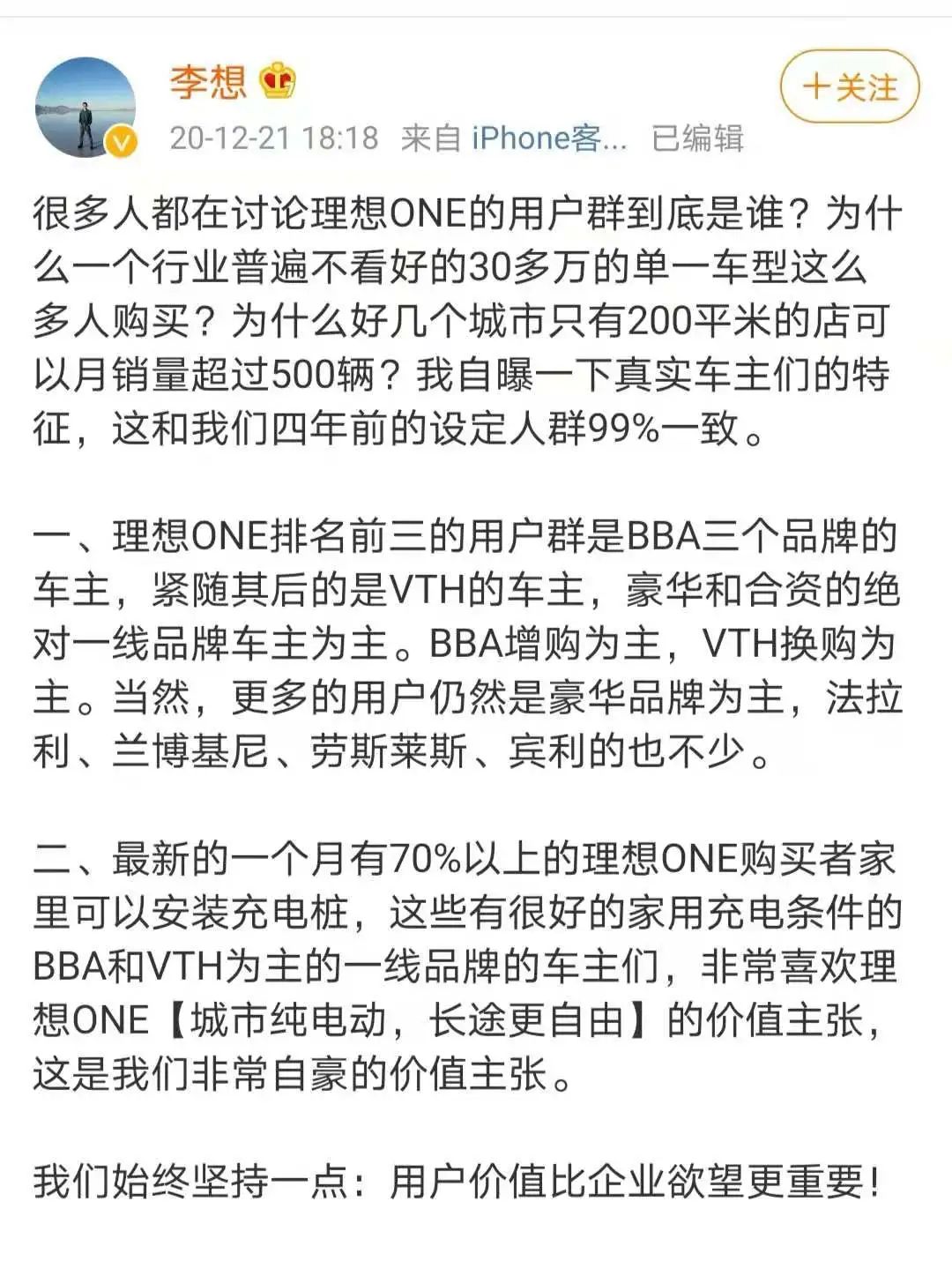 目前理想用户车主的真实特征,跟四年前创业时的设定人群 99%一致,存在高度重叠,这也侧面证实了创始人李想的判断力。“理想 ONE 如果只有宝马 X5 一半的价格,大家想不想买?”这个话有点夸张,但产品的差异化确实立得住了。