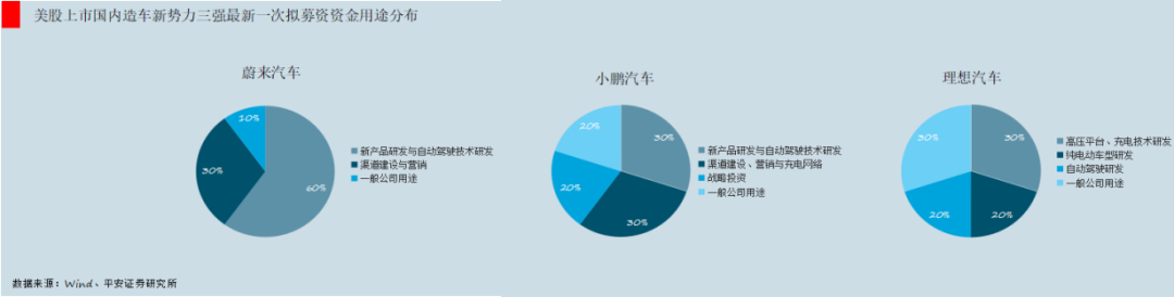 这个也能从最近的资金安排上看出来。以 2020 年 12 月蔚来、小鹏和理想三家的最新一次拟募资资金用途分布来看,蔚来汽车在新产品与自动驾驶驾驶技术研发上投入 60%、小鹏为 30%,而理想汽车在自动驾驶的研发投入上仅为 20%,是三家里相对较少的。[15]