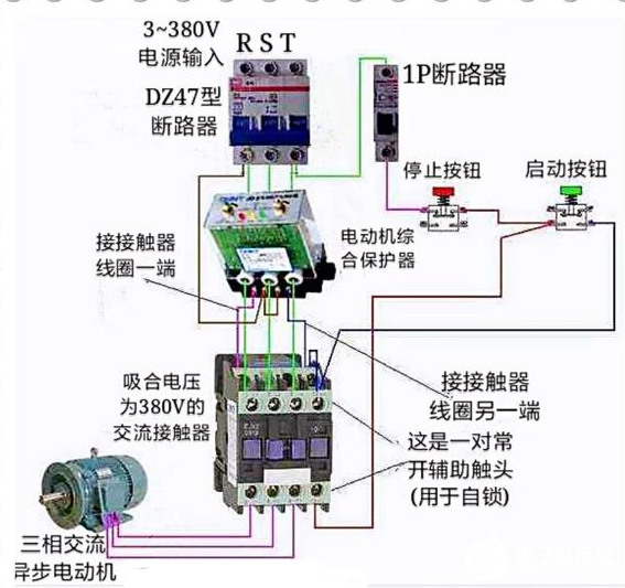 另外为了防止同样的故障出现,本人建议提问者购买一只电动机综合保护器(工作电压有220V、380V,自己根据三相电源的要求购买,这里建议购买电压为380V比较方便),另外添置一只交流接触器(吸合线圈电压为380V),一个停止按钮,一个启动按钮,一个1P断路器即可。按照下图所示连接。