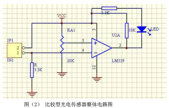 在上图中,LED灯相当于一个红外线发射管,JP1是红外线接收管,接收光强在上面转换成电流,在R上成为电压信号。当光线照射到白色面上时,光线反射强烈,光线照射到黑色面上时,光线反射较弱。因此当光照在不同颜色面上时,阻值会发生明显的变化。将阻值的变化值与RA1的标准值进行比较,就可以从LM339输出逻辑电平给单片机。