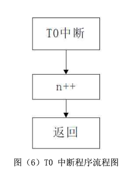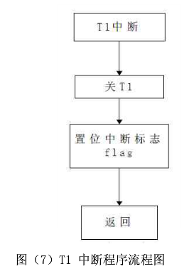 图(6)为T0中断程序流程图。T0对内部时钟脉冲计数,T0为8位定时器,1S定时的内部时钟脉冲超过了T0上限,故采用软件延时计数。图(7)为T1中断程序流程图,T1定时1S,当一秒定时到,则置位标志位。
