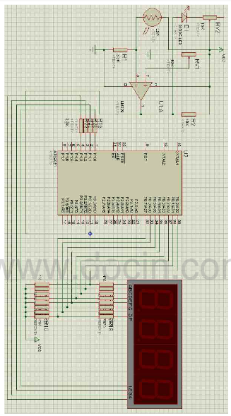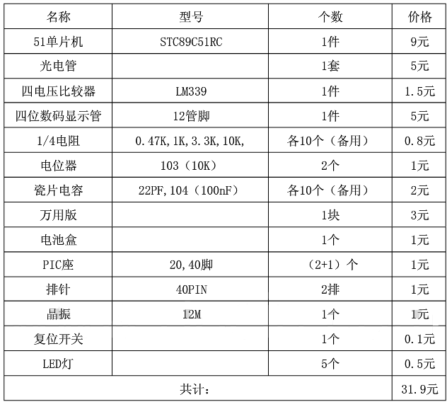 用一个红外发光二极管和一个接受红外光的二极管组成一套光电管。当检测到物表面为黑色时,反射光很弱,接收端检测到的光线可以忽略,使接收端呈现一种状态,例如开关管截止;当被检测物表面为白色时,反射光强烈,发射端发射的红外线被接收端全部接收,使接收端呈现另一种相反的状态,例如开关管开通。这两种相反的状态表现在电路中,就是高低电平组成的脉冲信号。由此,我想到用一个比较器来比较两种接受到的信号,从而输出“0”“1”两种高低电平,并把两种信号传给单片机进行统计,然后利用设定算法进行计算,最后通过数码显示管显示计算结果。