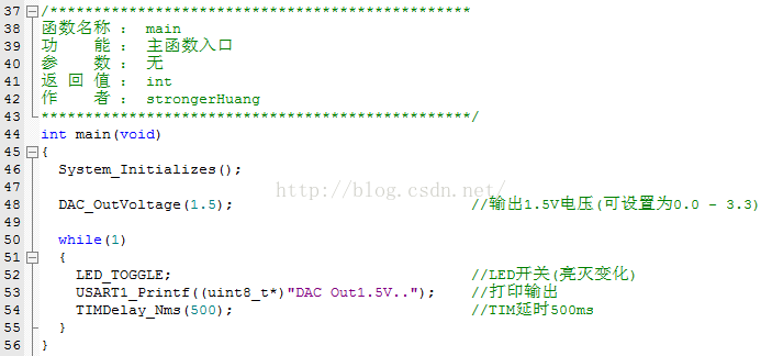 调用这个接口就可以在PA4引脚上输出相应的电压值(注意这个接口适用于参考电压为3.3V的情况下,若参考电压改了,换算的公式也要对应改,看源代码的人都应该知道怎么修改)。