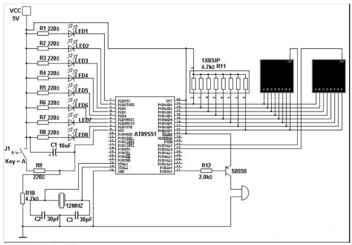 (2)八路发光二极管显示可以利用P1口接八个发光二极管实现这个功能;