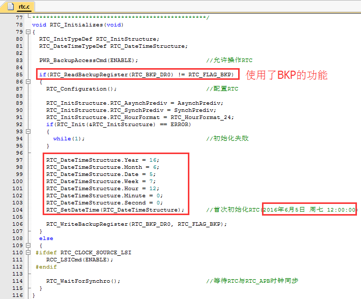 由于RTC属于后备区域,为了方便,这里同时也使用BKP的功能,就是防止软件每次复位都初始化时钟,这里写入后备区域BKP一个标志位,第一次才初始化,后面(只要VBAT, 后备区域有点)都不需要重新初始化了。
