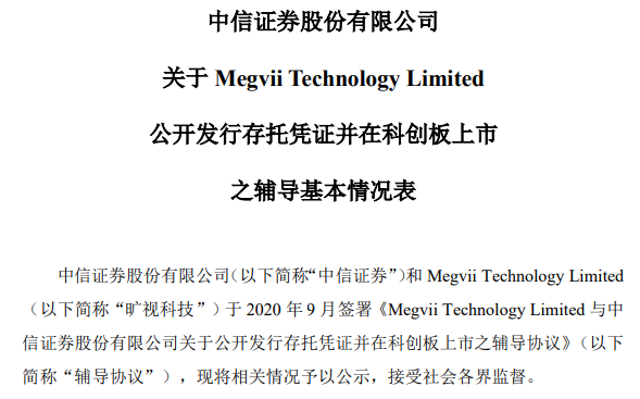 据披露,中信证券和Megvii Technology Limited (以下简称“旷视科技”)于2020年9月签署《Megvii Technology Limited 与中信证券股份有限公司关于公开发行存托凭证并在科创板上市之辅导协议》(以下简称“辅导协议”)。