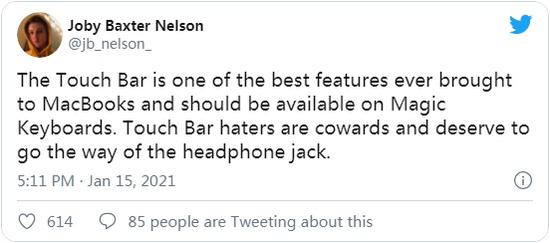 除了上述报告,Twitter 上也新涌现出了大量有关移除 Touch Bar 的讨论,可见许多 MacBook Pro 用户都对这项改动表示极其欢迎。