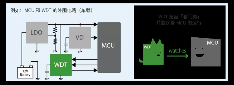 如前所述,WDT 监视 MCU 以检测异常。仅通过内置于 MCU 中的 WDT 监视 MCU 时,不能保证发生异常的 MCU 能够自我监视并检测异常。