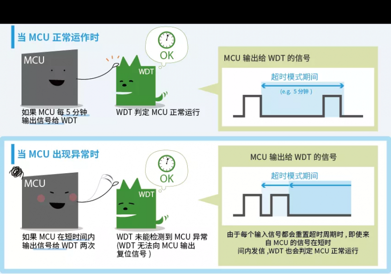 看门狗定时器以设定的时间间隔与 MCU 通信。如果在一定的期间内没有收到来自 MCU 的输入信号 / 输入的信号过多或输入信号与预定模式不同,定时器则判定 MCU 发生异常,并向 MCU 发送复位信号。