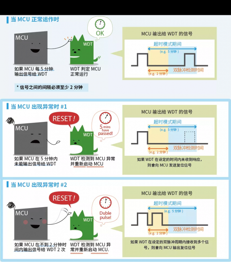 在超时模式下,如果 MCU 在设定的时间内输出多个信号(=双脉冲),WDT 则不会检测到 MCU 异常。