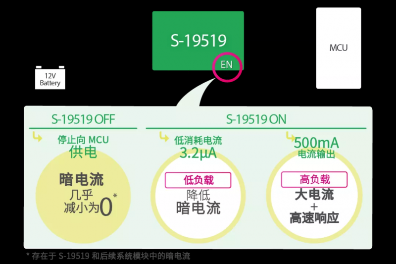 - 通过停止向 MCU 供电,暗电流几乎减小为零。如果由于高温条件而在 MCU 中产生较大的泄漏电流,则可以通过停止电源来防止泄漏电流。