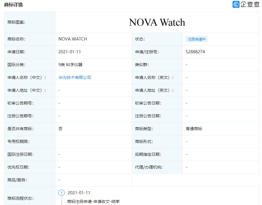 感谢IT之家网友热心线索投递,华为在 1 月 11 日申请了一个 “NOVA Watch”商标,现处于申请中状态。